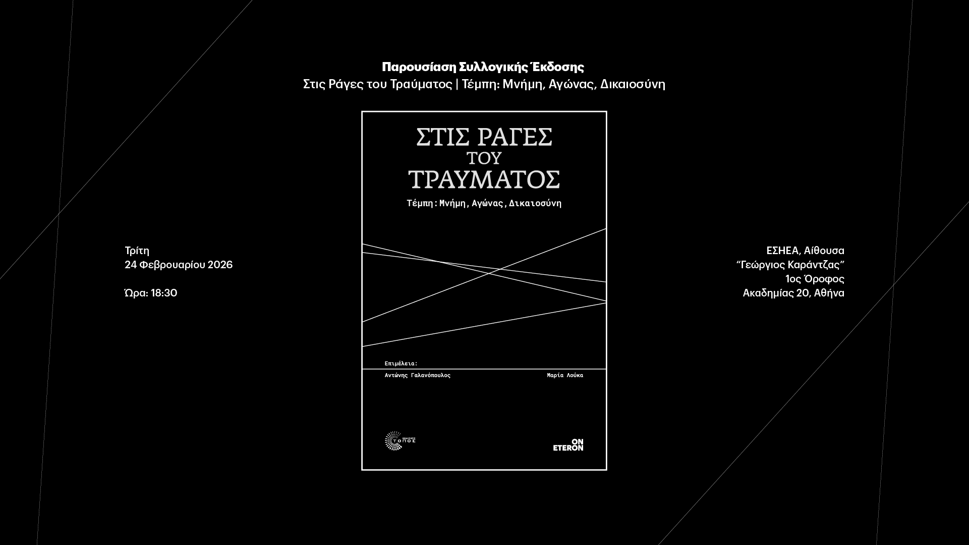 Το Eteron – Ινστιτούτο για την Έρευνα και την Κοινωνική Αλλαγή σε συνεργασία με τις εκδόσεις Τόπος εκδίδουν το βιβλίο «Στις Ράγες του Τραύματος – Τέμπη: Μνήμη, Αγώνας, Δικαιοσύνη». Πρόκειται για ένα συλλογικό εγχείρημα που τοποθετεί στο κέντρο του τα ανοιχτά ερωτήματα που πυροδότησε το συμβάν «Τέμπη», μια αστάθμητη και βαρυσήμαντη μεταβλητή στο κοινωνικοπολιτικό περιβάλλον. Το βιβλίο περιλαμβάνει ερευνητικές εργασίες και σύντομα δοκίμια που αναδεικνύουν διαφορετικές διαστάσεις του συμβάντος αυτού, με ιδιαίτερη έμφαση στο συλλογικό τραύμα που προκλήθηκε, τις κοινωνικές κινητοποιήσεις και τα χαρακτηριστικά τους και την κρίση εμπιστοσύνης στους θεσμούς.