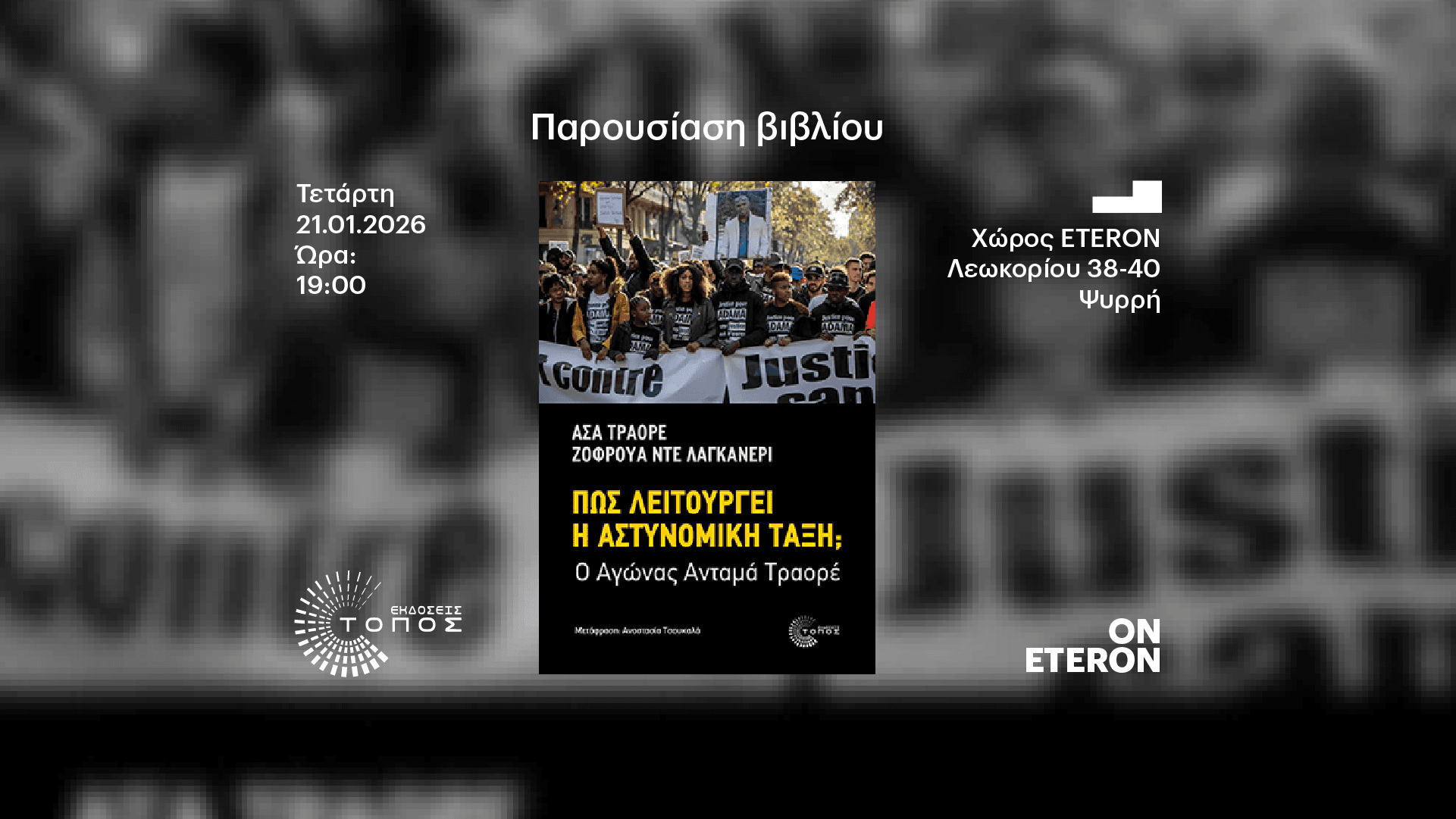 Το Eteron σε συνεργασία με τις Εκδόσεις Τόπος διοργανώνουν την παρουσίαση του βιβλίου «Πώς λειτουργεί η αστυνομική τάξη; – Ο Αγώνας Ανταμά Τραορέ», ενός έργου που φωτίζει τη λογική που διέπει τον θεσμό της αστυνομίας, τον μηχανισμό της αστυνομικής βίας καθώς και τις πολιτικές της διαστάσεις και τους κοινωνικούς αγώνες που γεννιούνται απέναντί της.