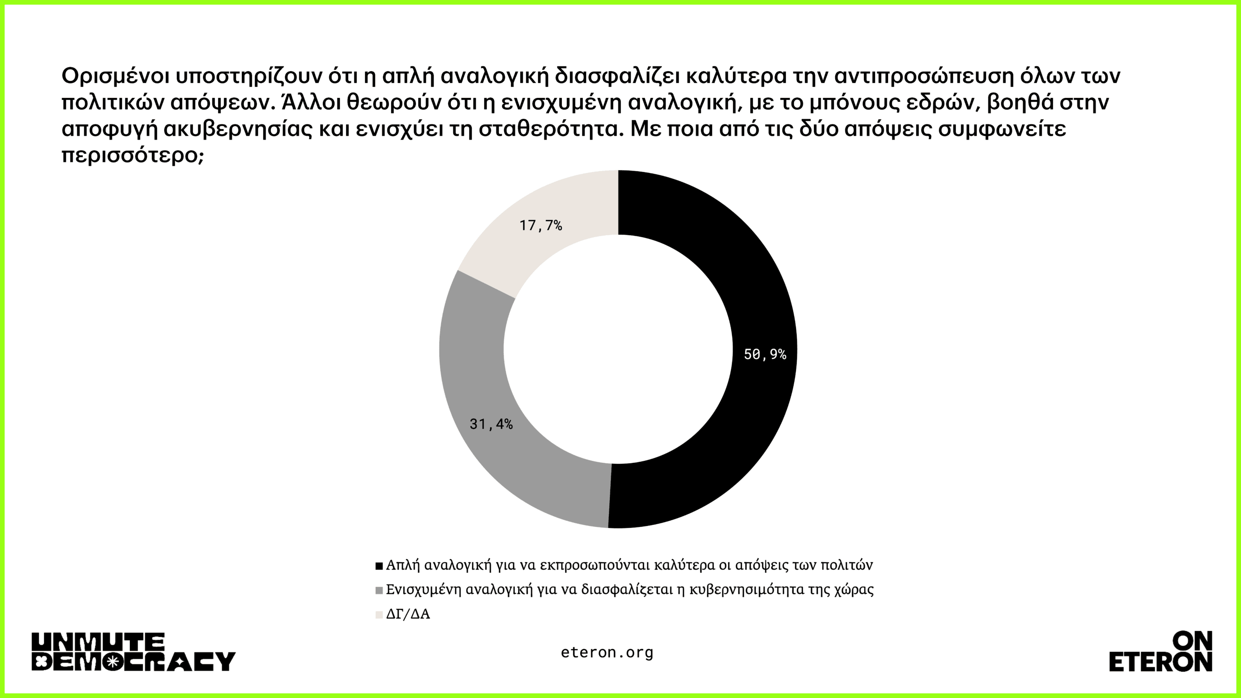 Έχοντας έναν αριθμό στοιχείων που αποδεικνύουν ότι οι πολίτες προβληματίζονται με την εκπροσώπησή τους και ευνοούν τις αρχές της αντιπροσώπευσης, επιχειρήσαμε να δούμε αν αυτή η θέση επηρεάζει την αντίληψή τους για το εκλογικό σύστημα με την επιλογή να είναι μεταξύ της απλής αναλογικής για την καλύτερη εκπροσώπηση και της ενισχυμένης αναλογικής για τη διασφάλιση της κυβερνησιμότητας. Σε αυτήν την ερώτηση είχαμε το υψηλότερο ποσοστό απαντήσεων που επέλεξαν το “δεν γνωρίζω/δεν απαντώ” (17,7%), και αυτό δείχνει τη δυσκολία του διλήμματος. Σε κάθε περίπτωση, η πλειοψηφία (50,9%) επιλέγει την απλή αναλογική, επιμένοντας στην αξία της αντιπροσώπευσης. Η μικρότερη στήριξη της απλής αναλογικής καταγράφεται μεταξύ των πολιτών ηλικίας άνω των 55 ετών (47,8%) και αντίστοιχα η μεγαλύτερη στους νέους και στις νέες 17-34 ετών (57,5%).