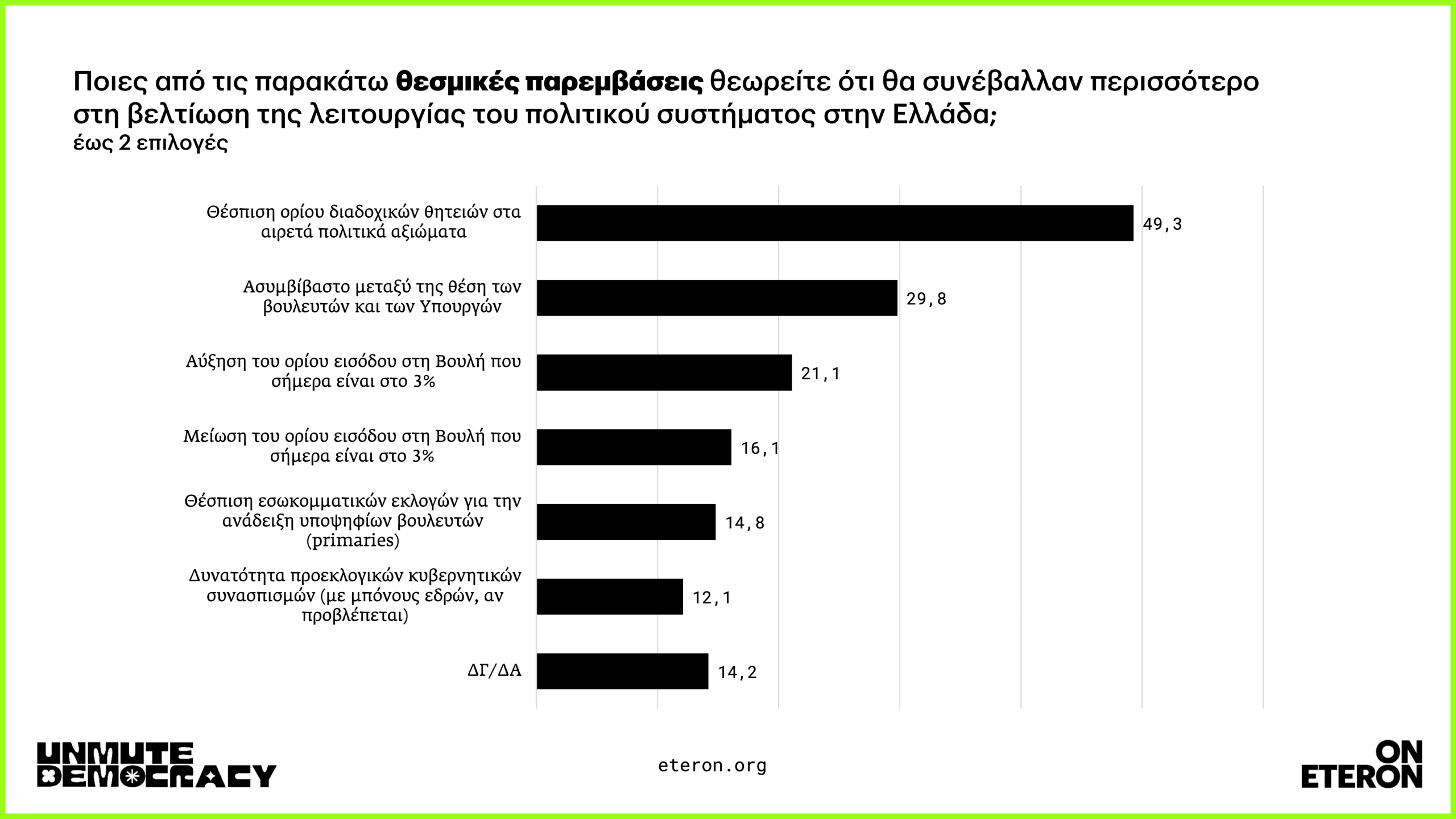 Είναι κοινός τόπος πως το Ελληνικό πολιτικό σύστημα χρειάζεται αλλαγές για να κερδίσει εκ νέου την εμπιστοσύνη των πολιτών. Στην έρευνα επιχειρήσαμε να εξερευνήσουμε την κατεύθυνση που επιθυμούν οι πολίτες να λάβουν αυτές οι αλλαγές.