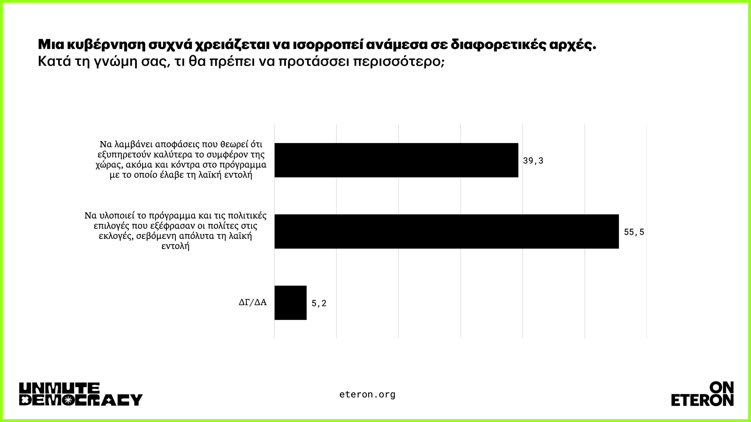 Αυτό το χάσμα μεταξύ αυτού που οι πολίτες θα ήθελαν να κάνουν οι κυβερνήσεις και μεταξύ αυτού που οι κυβερνήσεις -αναγκάζονται να- κάνουν εξηγεί, κατά τον Mair (2009, σ. 17), την απογοήτευση και τη δυσαρέσκεια που χαρακτηρίζει σήμερα τη δημοκρατία. Η υπόθεση, λοιπόν ήταν πως αυτό το χάσμα εμφανίζεται έντονα και στην Ελλάδα και πως αρκετά “κυβερνητικά” κόμματα θυσιάζουν συχνά τη λειτουργία της αντιπροσώπευσης μπροστά στην επίκληση της υπευθυνότητας. Έτσι θέσαμε έμμεσα αυτό το δίλημμα στους πολίτες, επιχειρώντας να περιγράψουμε δυο στάσεις που να εκφράζουν τις αρχές της αντιπροσώπευσης/ανταπόκρισης από τη μια και της υπευθυνότητας από την άλλη. Οι συμμετέχοντες/συμμετέχουσες στην έρευνα το αναγνώρισαν και η πλειοψηφία (55,5%) τοποθετήθηκε στην πλευρά της αντιπροσώπευσης/ανταπόκρισης, επιλέγοντας ως προτιμότερη τη θέση ότι οι κυβερνήσεις πρέπει να υλοποιούν το πρόγραμμα και τις πολιτικές επιλογές που εξέφρασαν οι πολίτες στις εκλογές, σεβόμενες απόλυτα τη λαϊκή εντολή. Αντίθετα, στη λογική της υπευθυνότητας τοποθετήθηκε το 39,3% εκτιμώντας πως οι κυβερνήσεις πρέπει να λαμβάνουν αποφάσεις που θεωρούν ότι εξυπηρετούν καλύτερα το συμφέρον της χώρας, ακόμα και κόντρα στο πρόγραμμα με το οποίο έλαβαν τη λαϊκή εντολή.