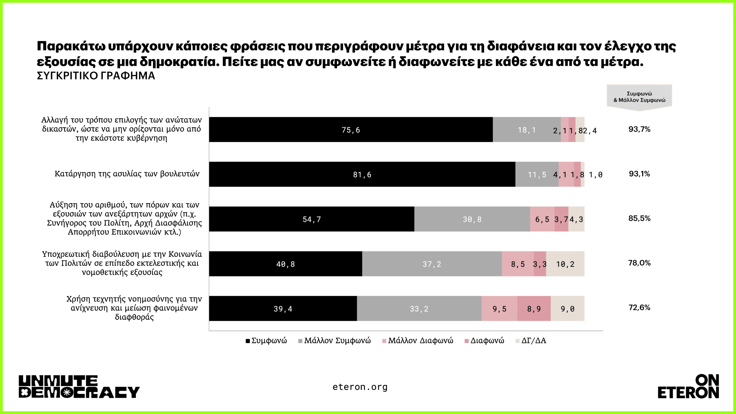 Το τελευταίο σύνολο ερωτήσεων εξετάζει μέτρα για τη διαφάνεια και τον έλεγχο της εξουσίας. Και εδώ δόθηκε στους συμμετέχοντες και τις συμμετέχουσες στην έρευνα η δυνατότητα να αξιολογήσουν πέντε πιθανά μέτρα. Αν φέρουμε ξανά στον νου μας το γεγονός ότι τα ζητήματα της διαφοράς και της δικαιοσύνης αξιολογήθηκαν ως πρωτεύοντα απο τους πολίτες, τότε η επιλογή τους σε αυτό το σύνολο ερωτήσεων δεν είναι απλώς εύλογη αλλά και συνεπής. Τα δύο μέτρα που γνωρίζουν σχεδόν καθολική αποδοχή είναι η αλλαγή του τρόπου επιλογής των ανωτάτων δικαστών, ώστε να μην ορίζονται από την εκάστοτε κυβέρνηση (93,7%) και η κατάργηση της βουλευτικής ασυλίας (93,1%).